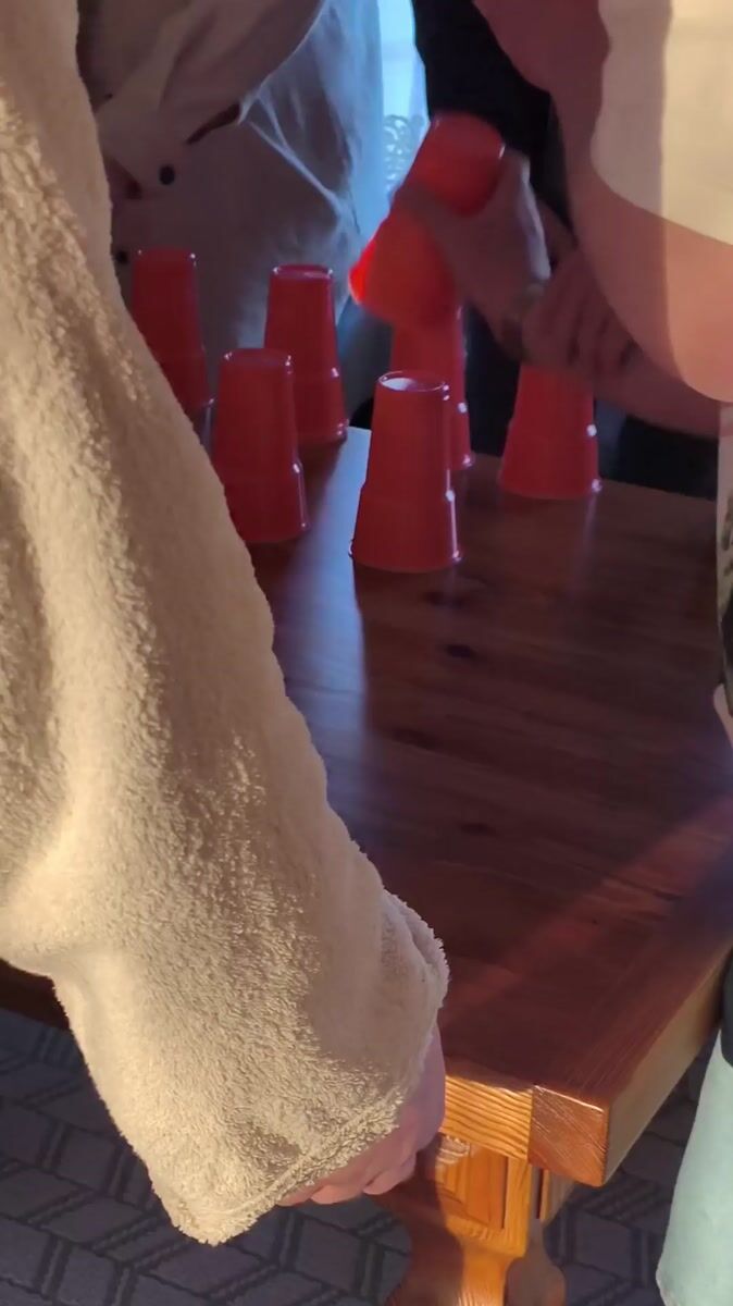 Topics: cup stacking, paddleboarding, sauna, tea service, cabin retreat, lakeside recreation, group gathering, leisure activity, rural tourism, social