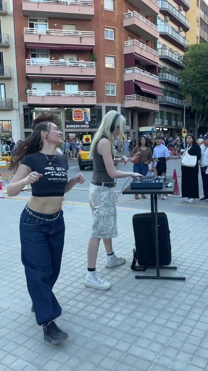 Topics: street dj, sidewalk dance, impromptu performance, street performance, public music, urban entertainment, street culture, social gathering, urban life, daily life