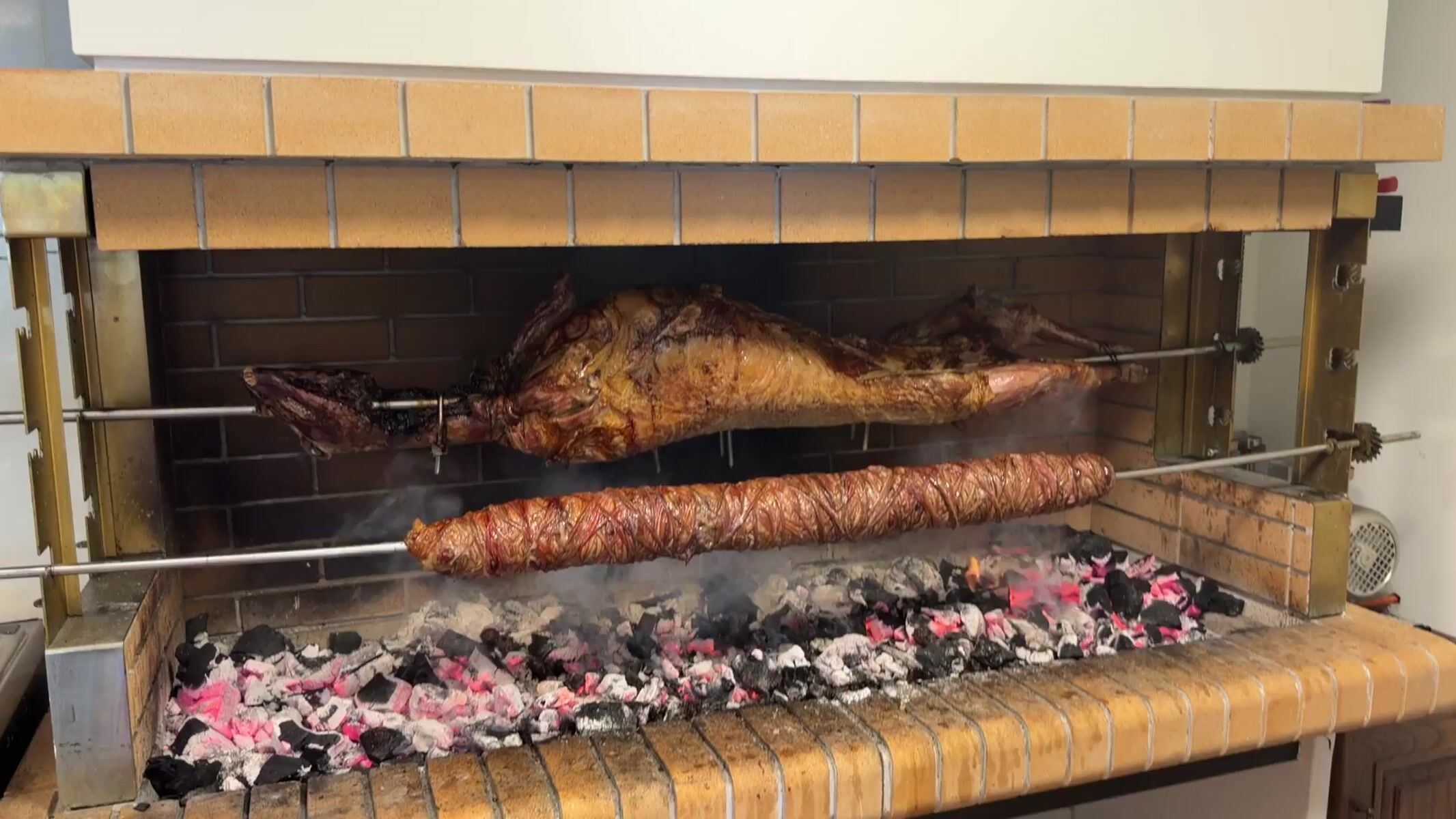 Topics: lamb roasting, kokoretsi, greek cuisine, traditional cooking, family gathering, home dining, domestic life, cultural tradition, food preparation, daily life