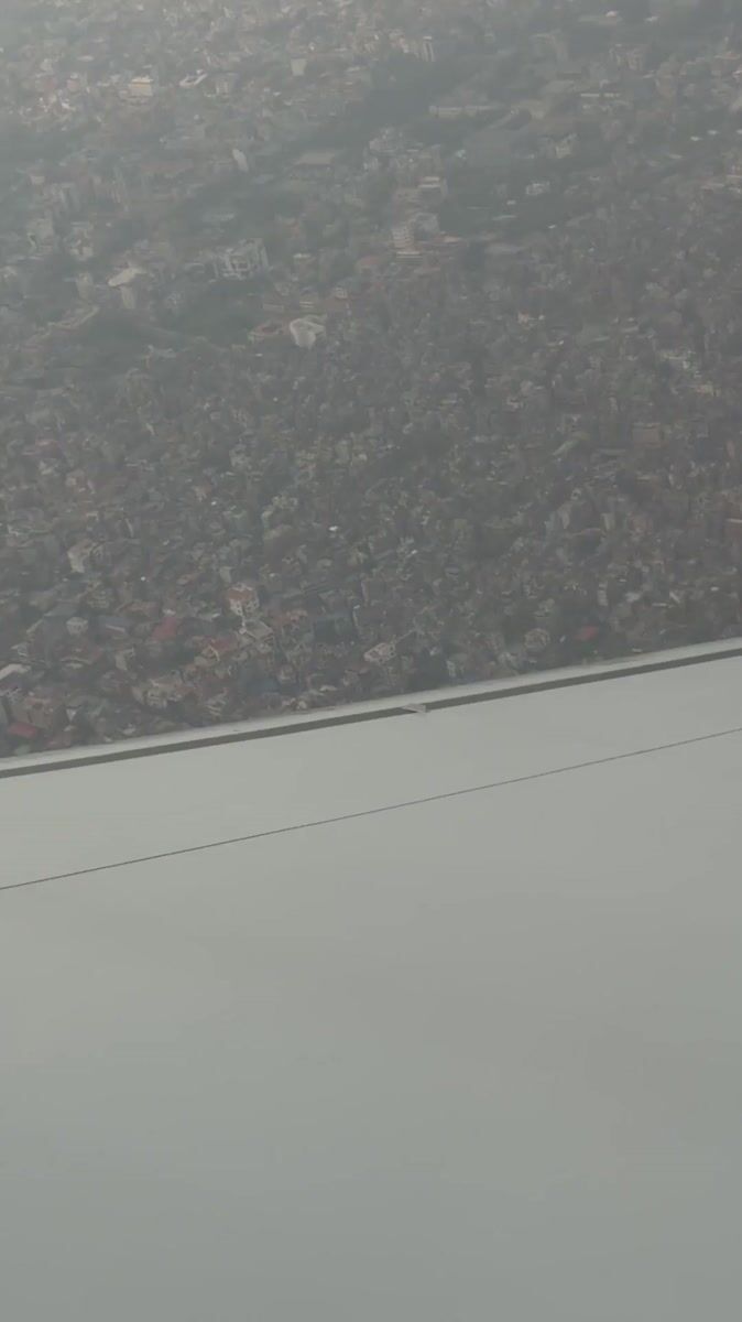 Aircraft passenger films hazy aerial view of Kathmandu cityscape