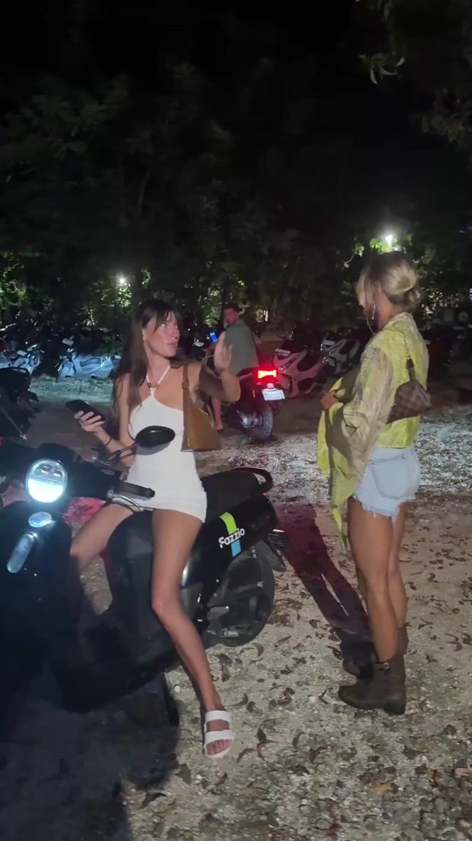 Topics: scooter gathering, nighttime parking, cell phone use, motorcycle meetup, social gathering, nightlife, transportation, urban, social, daily life