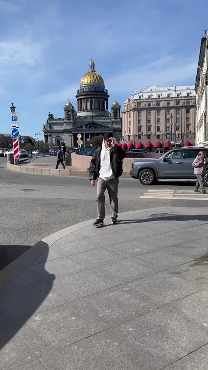 Man makes peace sign while walking in Saint Petersburg