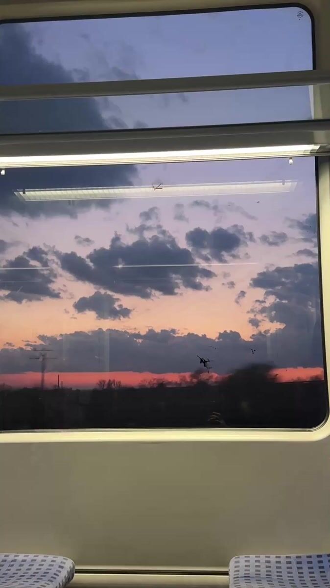 Topics: train window, sunset gradient, railway travel, transportation, evening sky, landscape, travel, daily life, nature, scenic