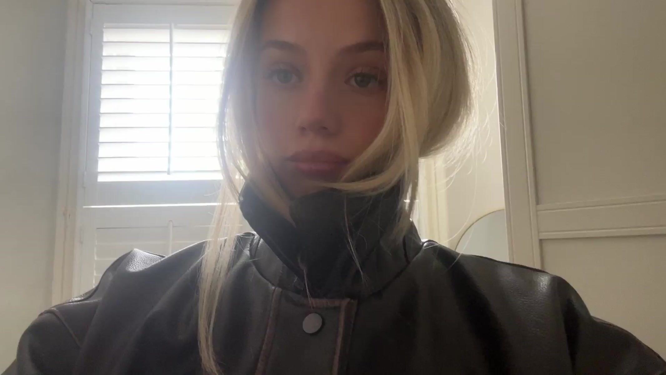 Woman takes playful selfies in black leather jacket, London