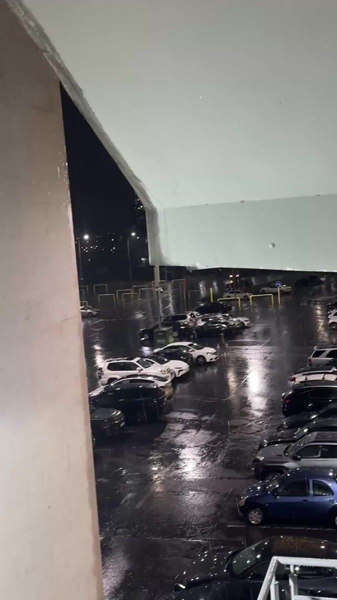 Person photographs Tokyo Tower from rooftop with refreshments setup