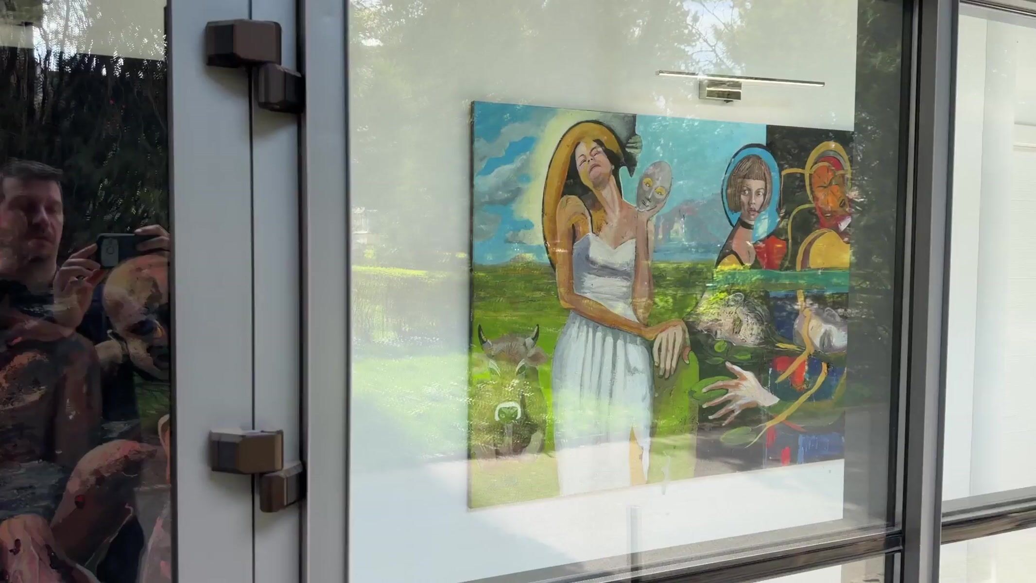 Topics: oil painting, female portrait, glass display, art exhibition, gallery window, visual art, cultural, urban, romania, daily life