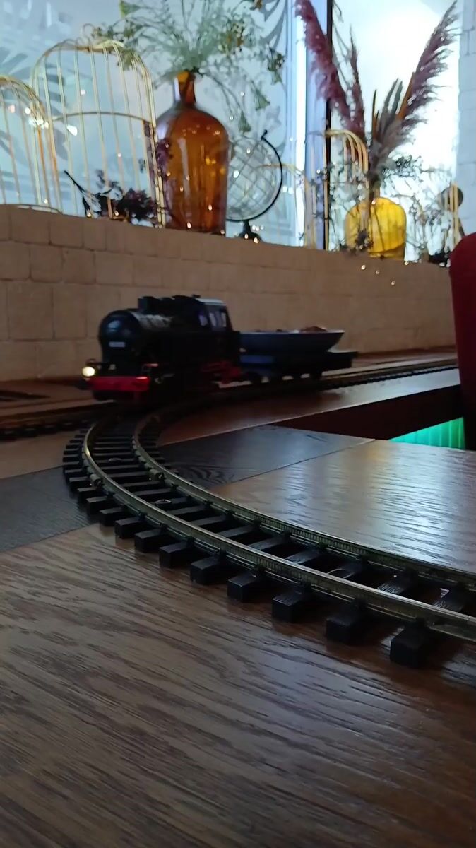 Topics: toy train, novelty restaurant, food delivery, steam train, dining experience, gourmet food, restaurant interior, entertainment, hospitality, daily life