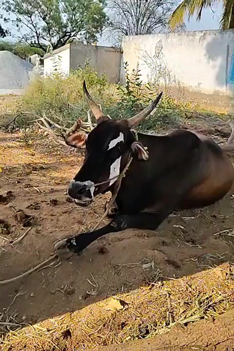 Tethered cow rests on ground in Indian village