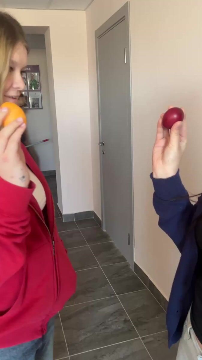 Topics: hallway interaction, orange smelling, casual dancing, chess pieces, indoor moment, social, daily life, leisure, domestic, urban