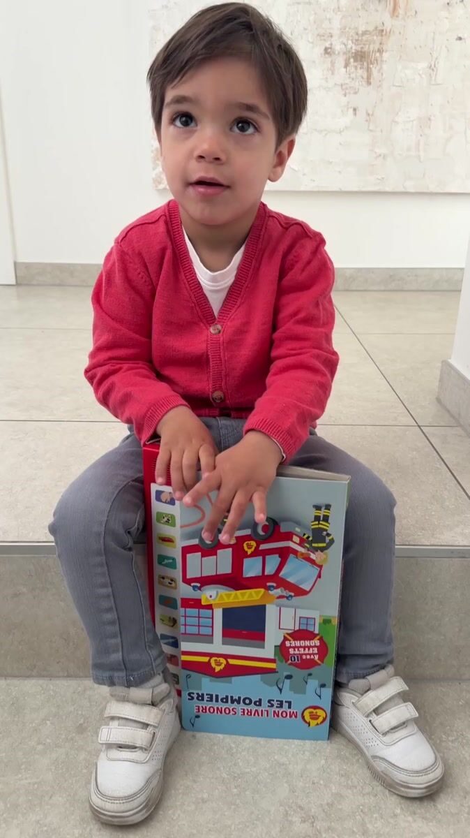 Toddler reads firefighter sound book in Luxembourg home Friday morning