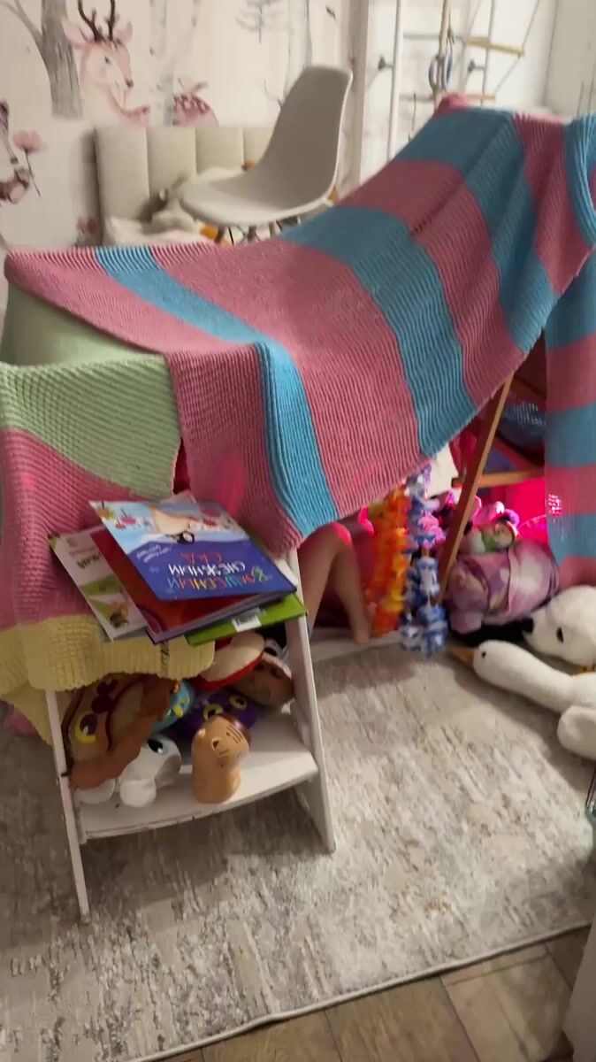 Topics: blanket fort, string lights, stuffed animals, indoor play, childhood, home activity, family life, domestic, leisure, daily life