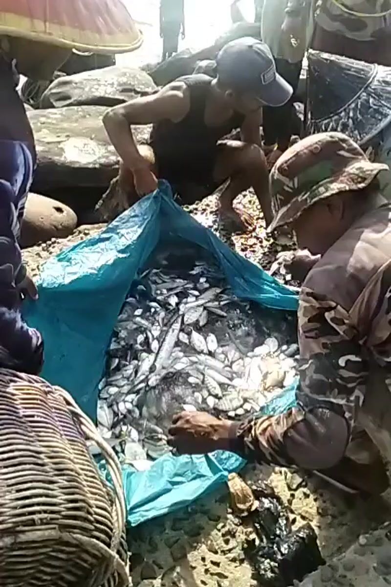 Indonesian fishermen haul large catch during coastal net fishing operation