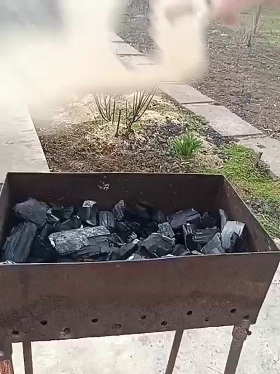 Topics: charcoal grill, outdoor barbecue, fanning coals, gathering, cooking, outdoor activity, social, leisure, daily life, domestic