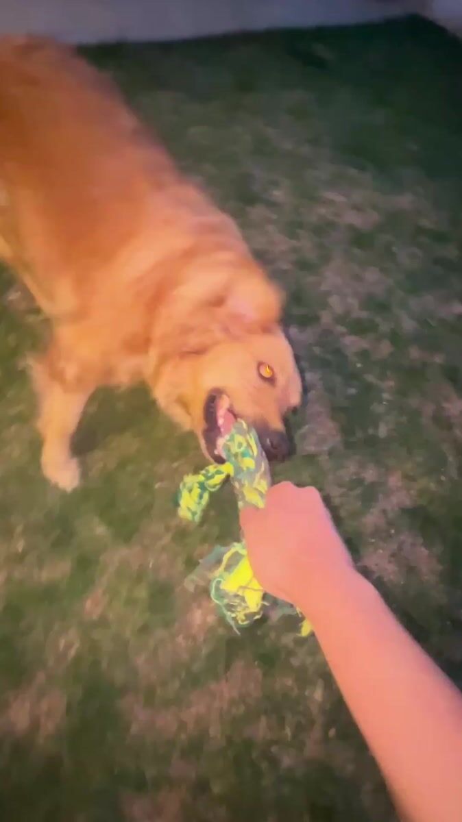 Golden retriever plays tug-of-war in Mexico neighborhood