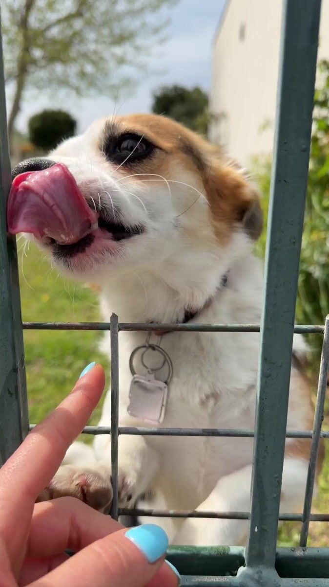Topics: dog petting, fence interaction, animal contact, pet encounter, street animal, human animal, outdoor, community, daily life, social