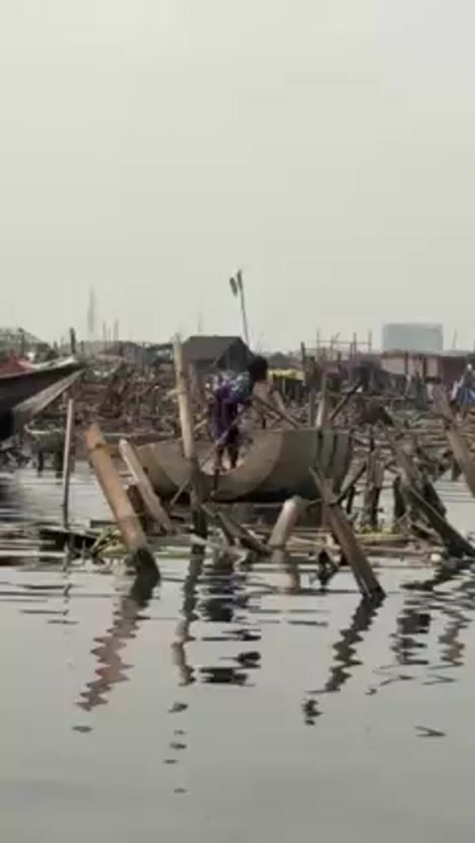 Person poles makeshift concrete boat through Lagos waterway