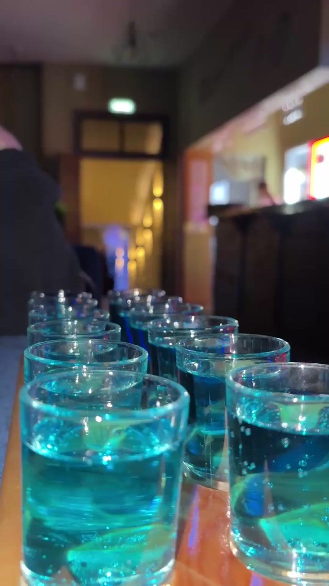 Topics: blue drinks, alcohol service, wooden tray, bar service, beverage, hospitality, social drinking, nightlife, food service, daily life