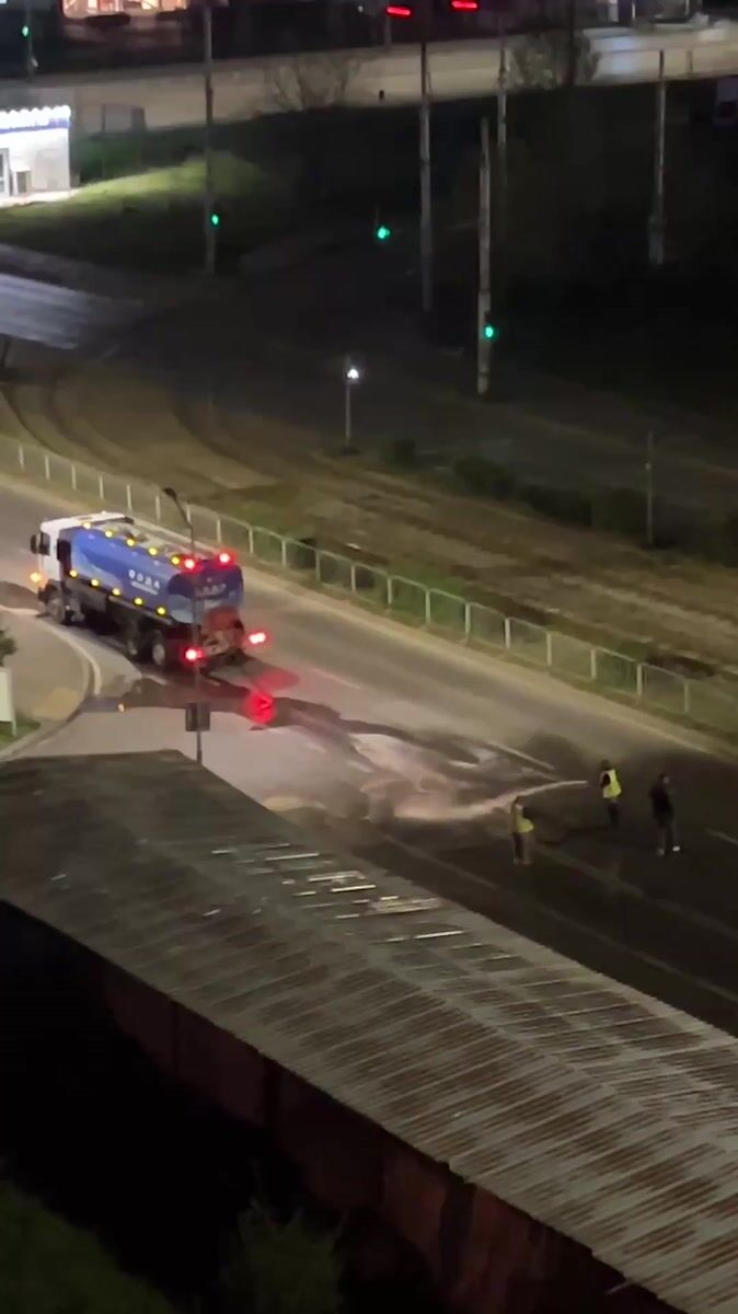 Topics: road spraying, water truck, night maintenance, street cleaning, municipal work, infrastructure, urban services, nighttime, city maintenance, public works
