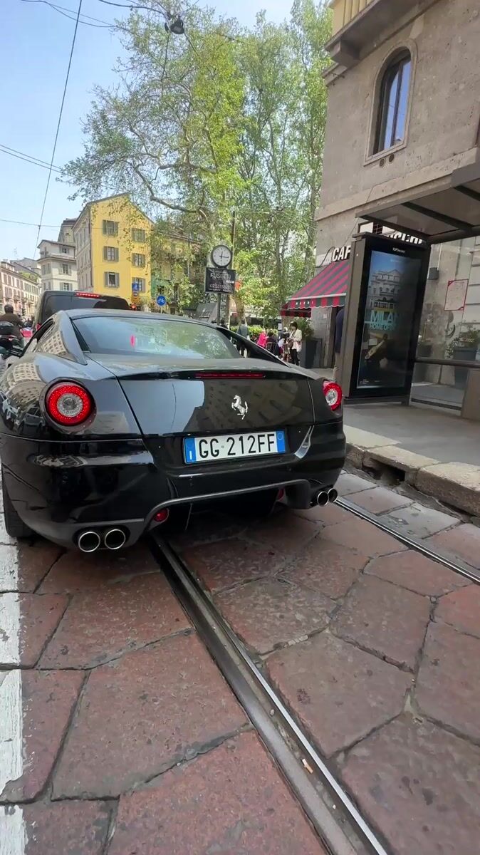 Black Ferrari spotted on Milan cobblestone streets Saturday morning