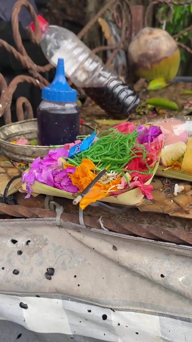 Topics: canang sari, balinese temple, flower market, hindu offering, religious ritual, traditional culture, market scene, cultural heritage, spiritual practice, daily life