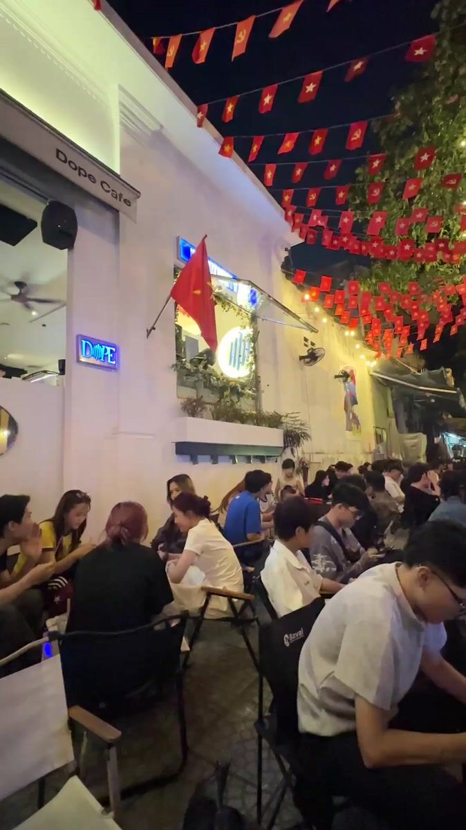 Topics: vietnamese cafe, flag decoration, outdoor dining, cafe culture, nightlife, social gathering, youth culture, urban dining, social, daily life