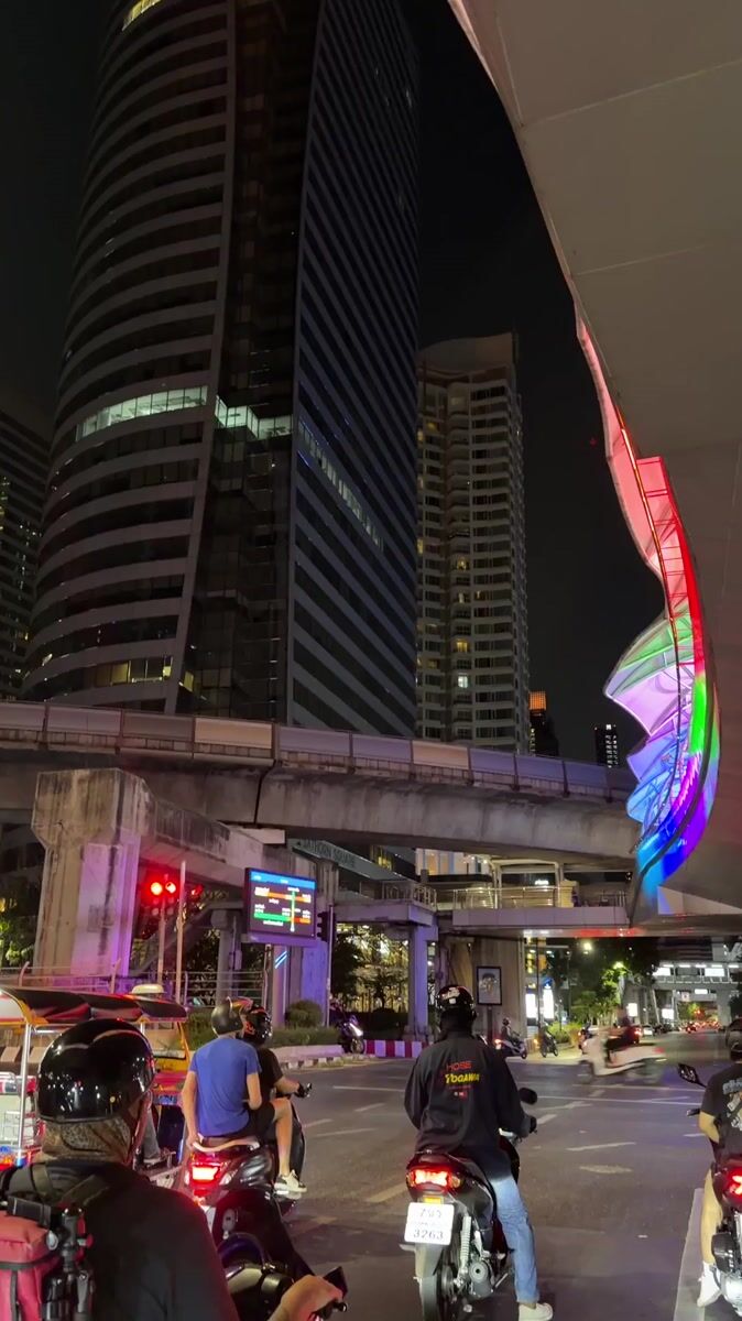 Topics: traffic light, tuk-tuk, modern building, nighttime, urban transport, street scene, architecture, traffic, urban, daily life