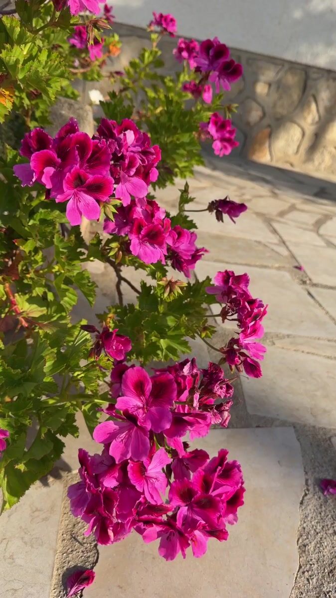 Topics: morning walk, mediterranean architecture, small dog, residential area, palm trees, swimming pool, neighborhood, daily life, urban, outdoor