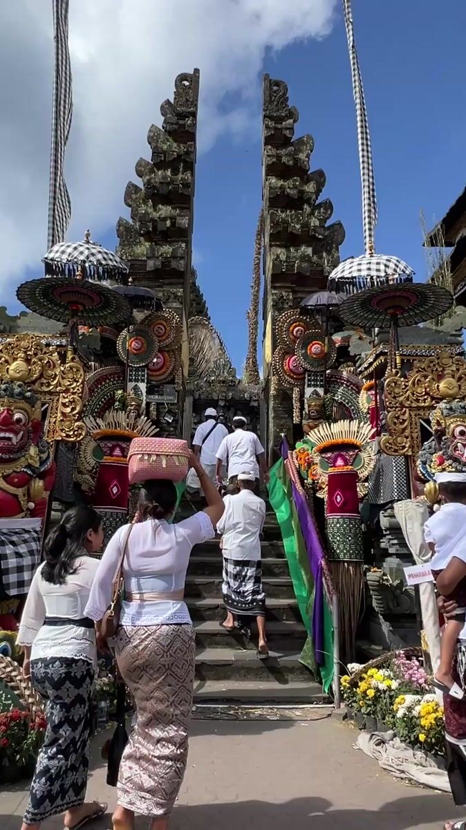 Topics: balinese temple, temple steps, traditional clothing, religious site, family visit, cultural practice, tourism, heritage, spiritual, daily life