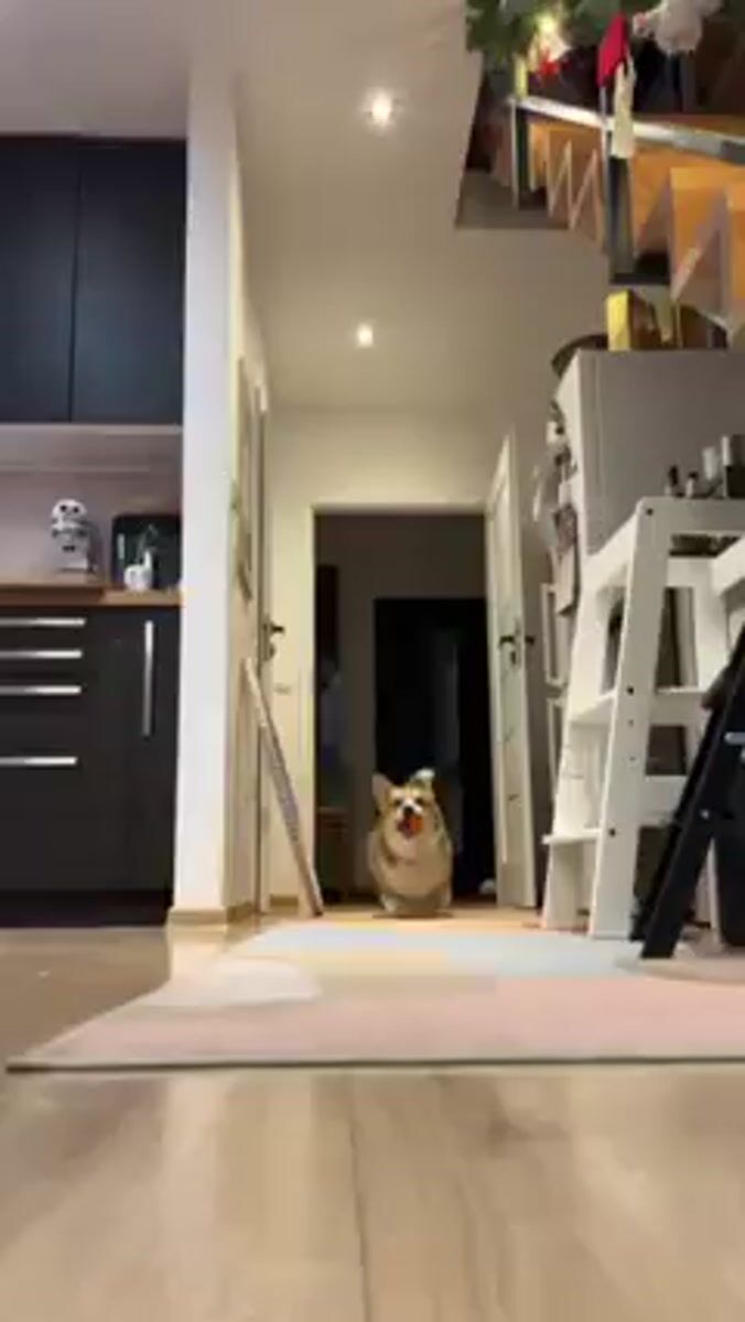 Topics: corgi dog, home cooking, roasted vegetables, pet play, domestic life, food preparation, german village, indoor activity, daily life, rural