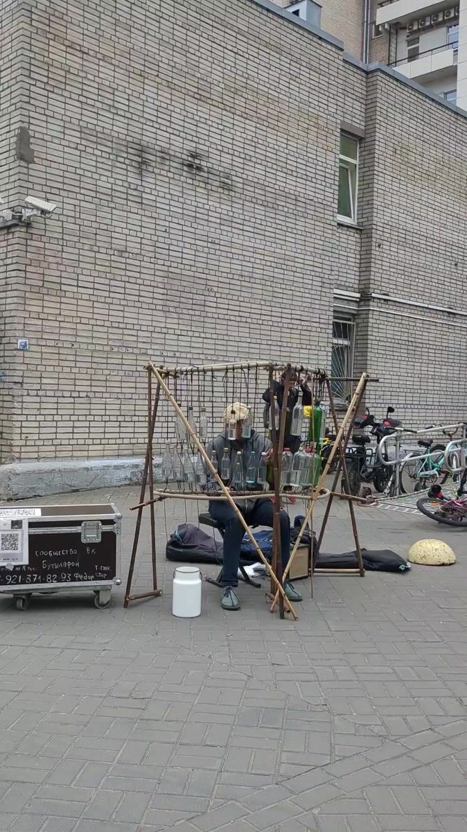 Topics: bottle xylophone, glass instrument, street musician, busking, street performance, music, urban culture, entertainment, daily life, social