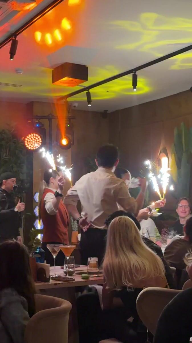 Moscow restaurant staff deliver sparkler dessert to celebrating diners