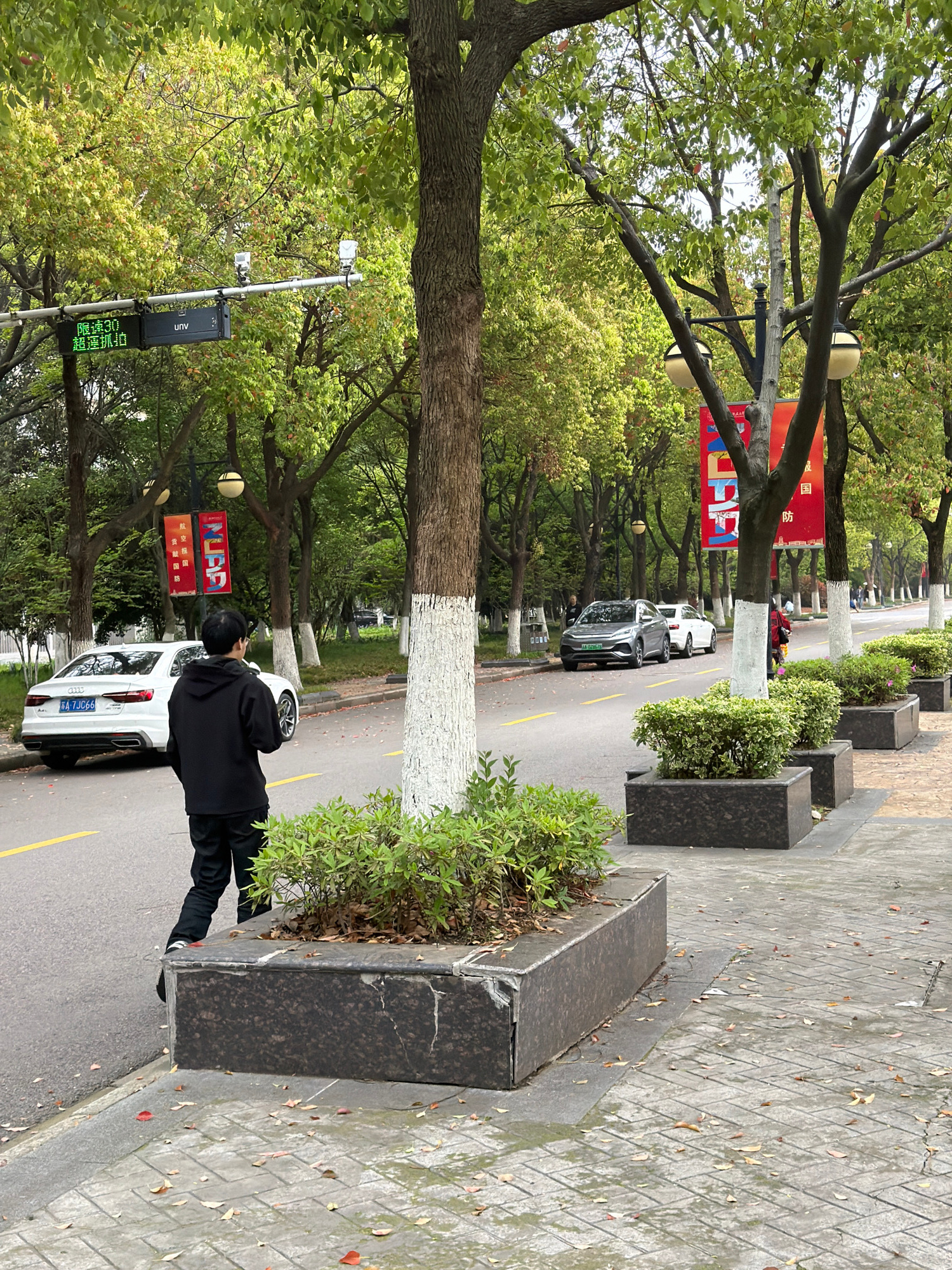 Here's a detailed description of the image: **Setting and Environment:** The image appears to be taken on a tree-lined street in Jiangning District, China. The street has trees planted along the road…read more