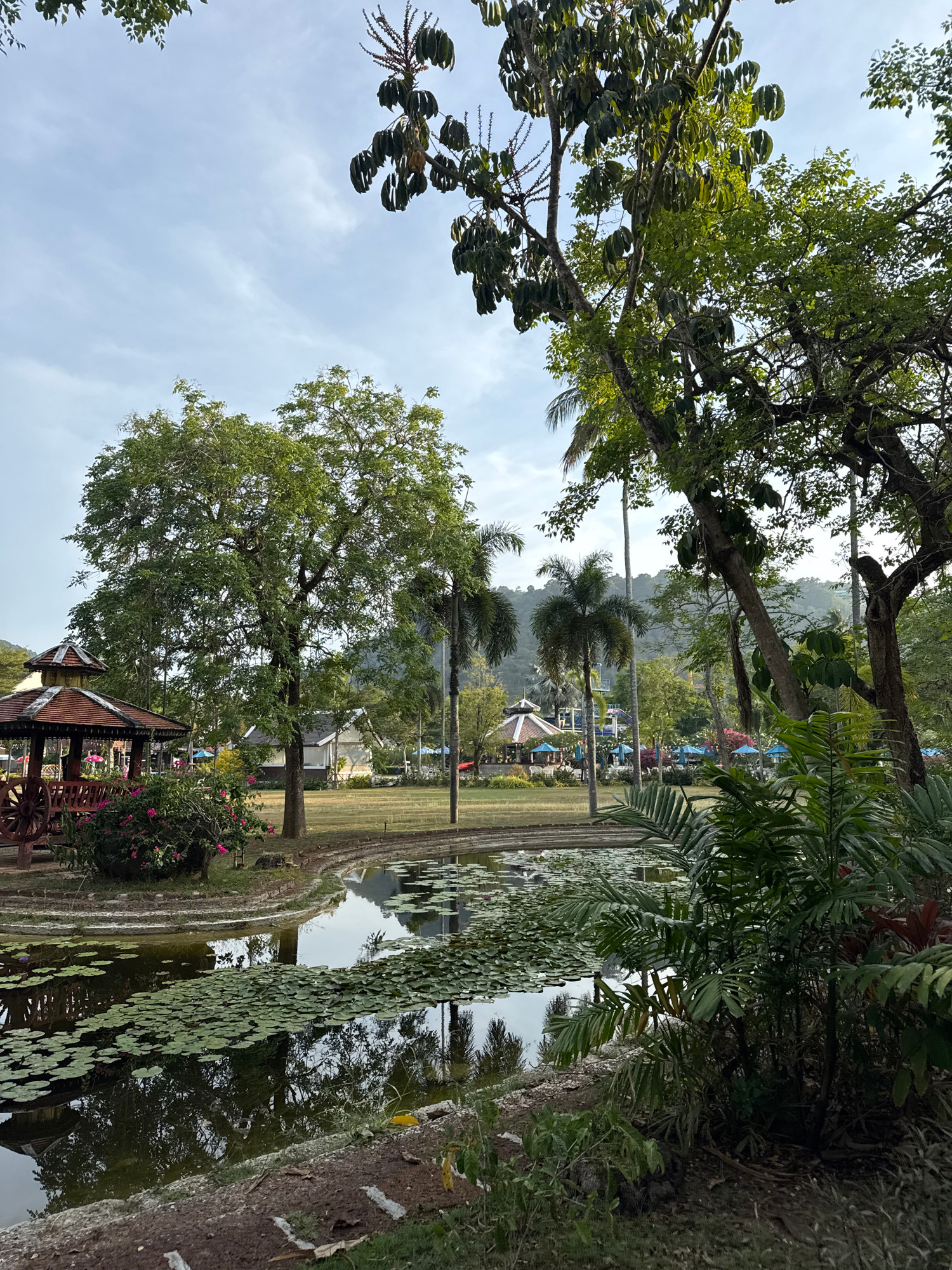 The image depicts a park in Patong, Thailand. The foreground features lush greenery and a pond covered with lily pads. A traditional Thai-style gazebo is visible near the pond's edge. Tall palm trees…read more
