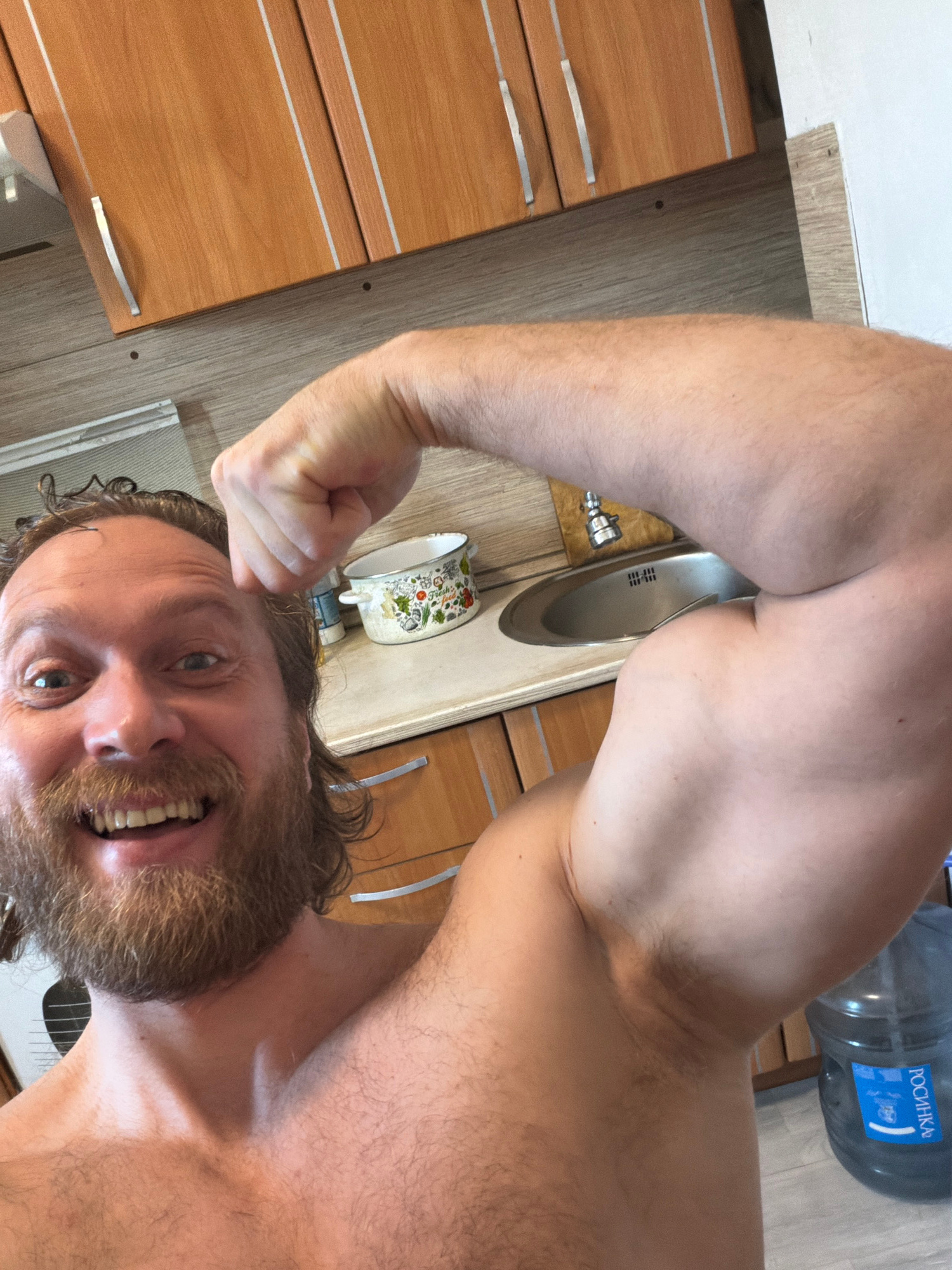 The image is a vertical, close-up selfie of a shirtless man, appearing to be taken in an indoor setting like a kitchen or utility room. The man, likely in his 30s or 40s, has a full reddish-brown bear…read more