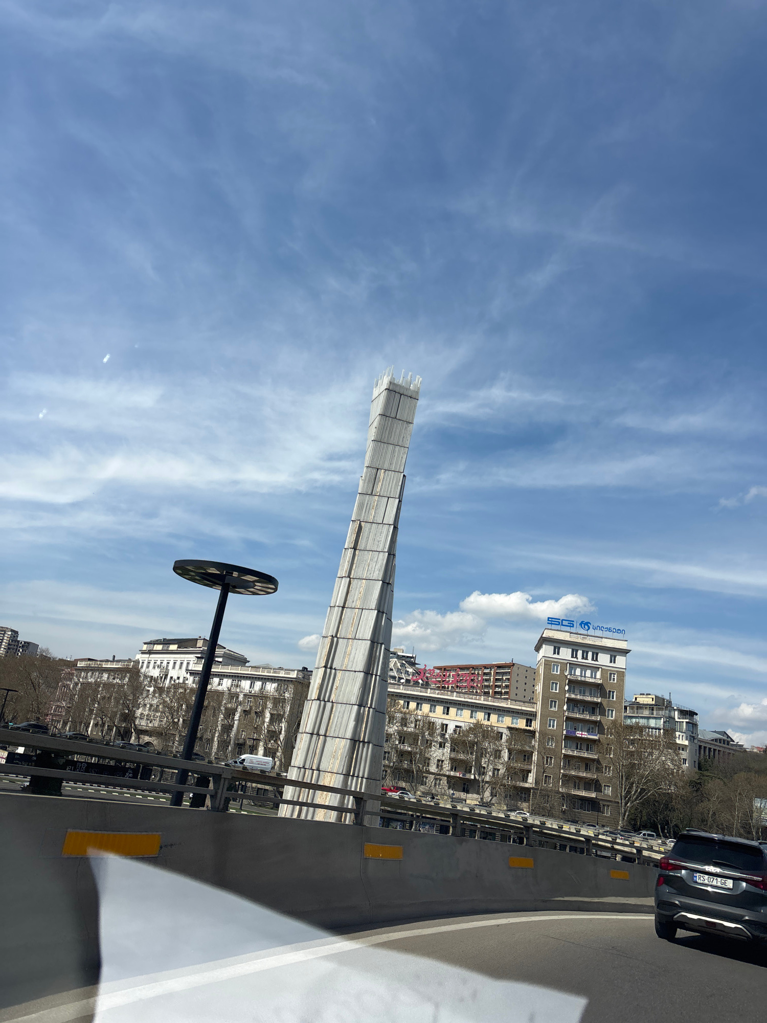 The image shows a tall, thin monument encased in scaffolding against a blue sky with scattered clouds. The scene is likely located in Tbilisi, Georgia based on the city buildings visible in the backgr…read more