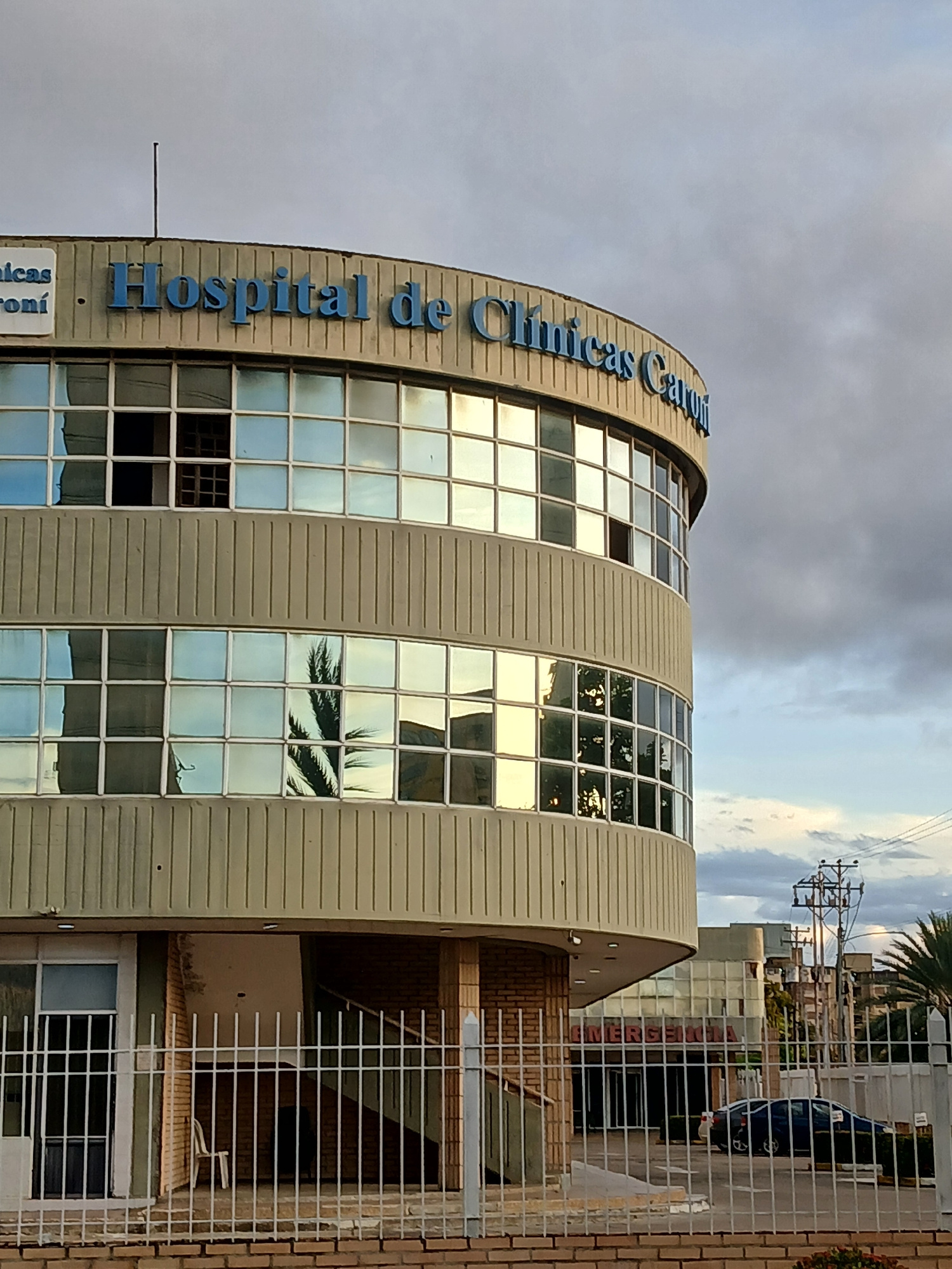 The image shows the exterior of Hospital de Clínicas Caroní in Ciudad Guayana, Venezuela. The building is a curved structure with multiple windows reflecting the sky and surrounding vegetation. The hospital's name is displayed in blue lettering on the exterior. A fence is visible in the foreground, and power lines can be seen in the background. A dark-colored vehicle is parked near the building's entrance. The sky is overcast. | Open Wire
