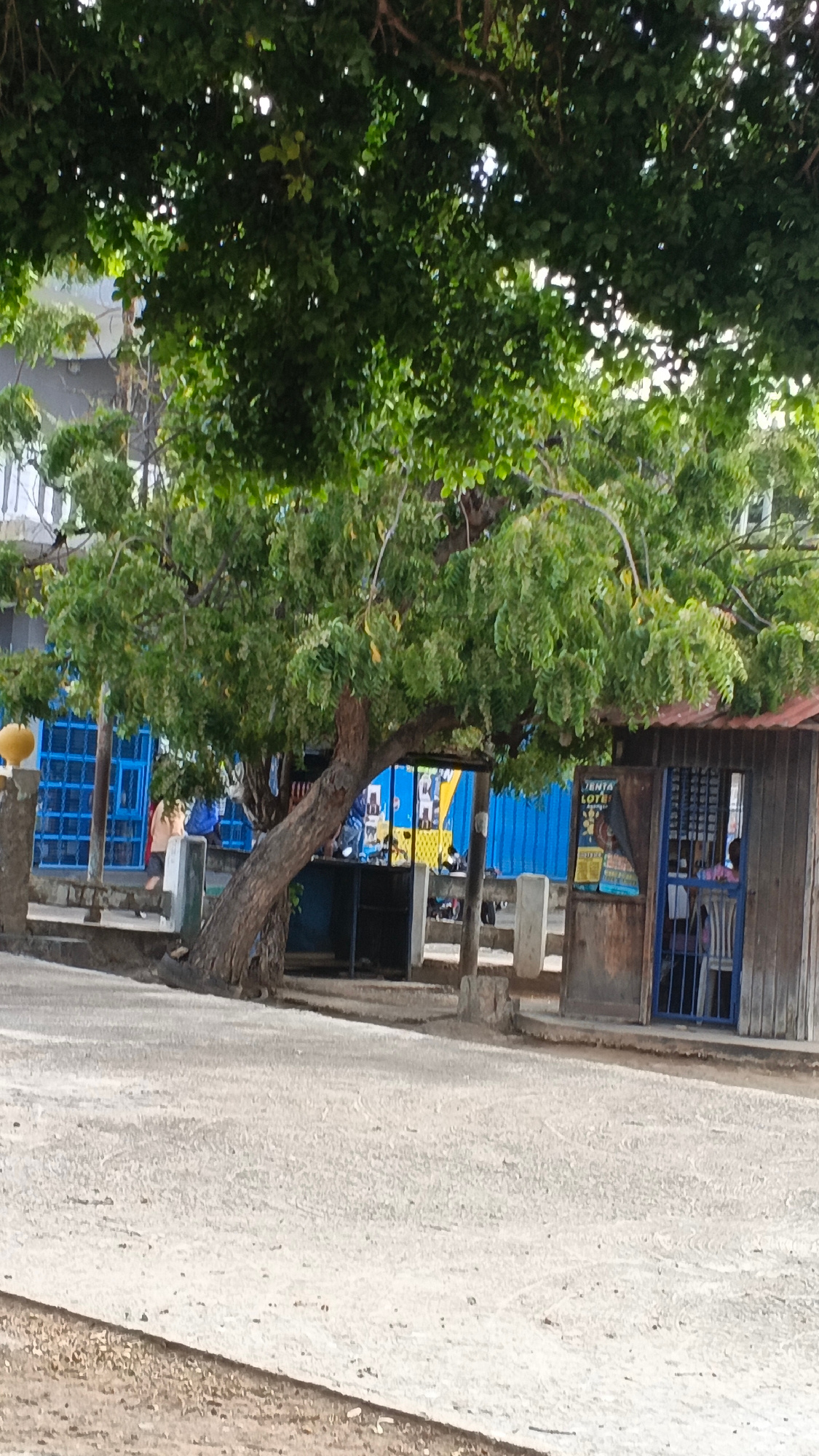 The image depicts a street scene in Juan Griego, Venezuela, characterized by a large, leafy tree that dominates the foreground. The tree's branches extend across the upper portion of the frame, provid…read more