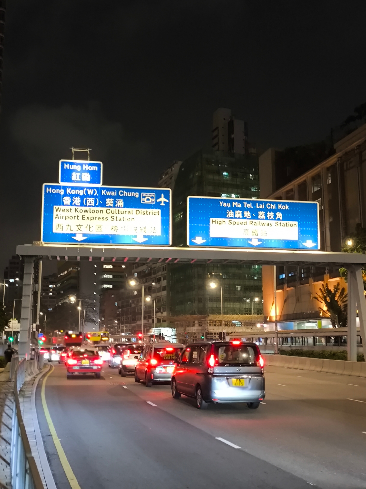 The image captures a nighttime urban road scene in Hong Kong, China, specifically in the Kowloon area, near approaches to West Kowloon, Hung Hom, Kwai Chung, Yau Ma Tei, and Lai Chi Kok. The foregrou…read more