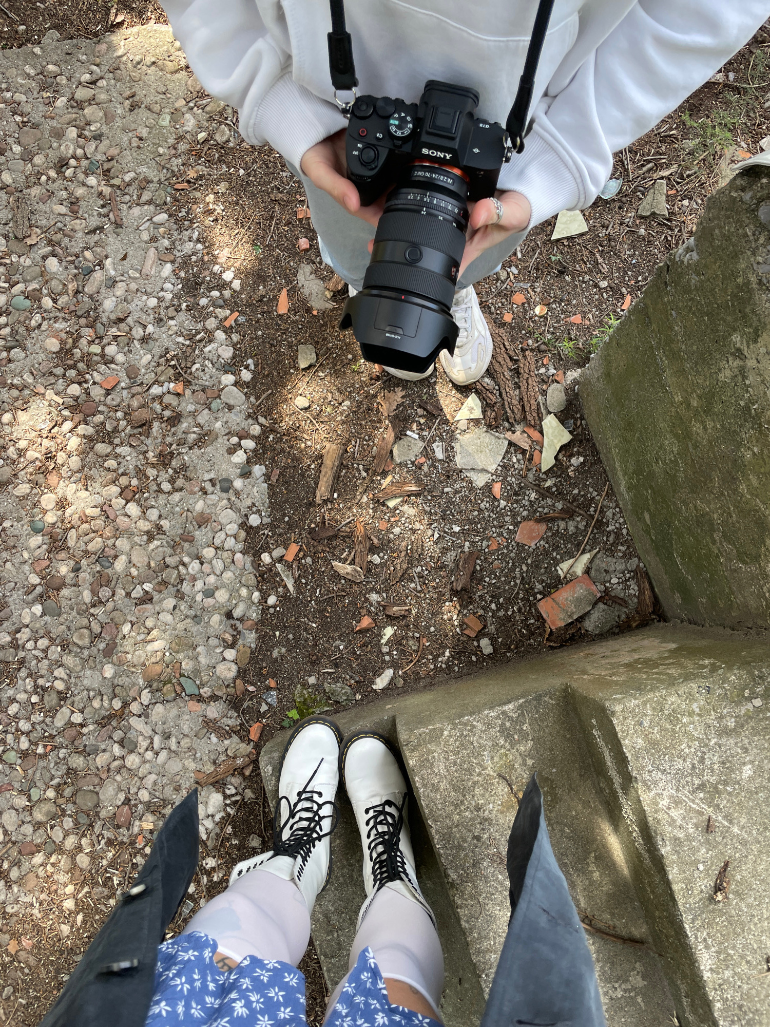 Overhead shot of a scene at a concrete exterior, possibly in Kamenovo, Montenegro. Two people's lower bodies are visible. The person on the left is holding a Sony camera with a black lens and wearing…read more