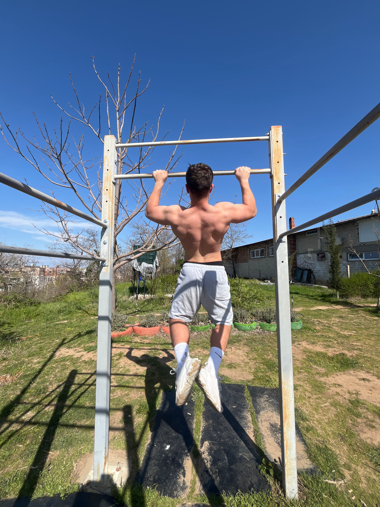 A shirtless man in gray shorts and white socks and shoes is performing a pull-up on a rusty metal structure in a grassy yard. The sky is blue and clear. A building and some trees are visible in the ba…read more
