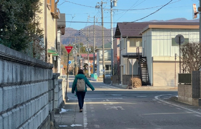 The image displays a street scene in Karuizawa, Japan, under clear daylight conditions. An adult individual, viewed from behind, walks away from the camera on a concrete sidewalk. This individual is d…read more