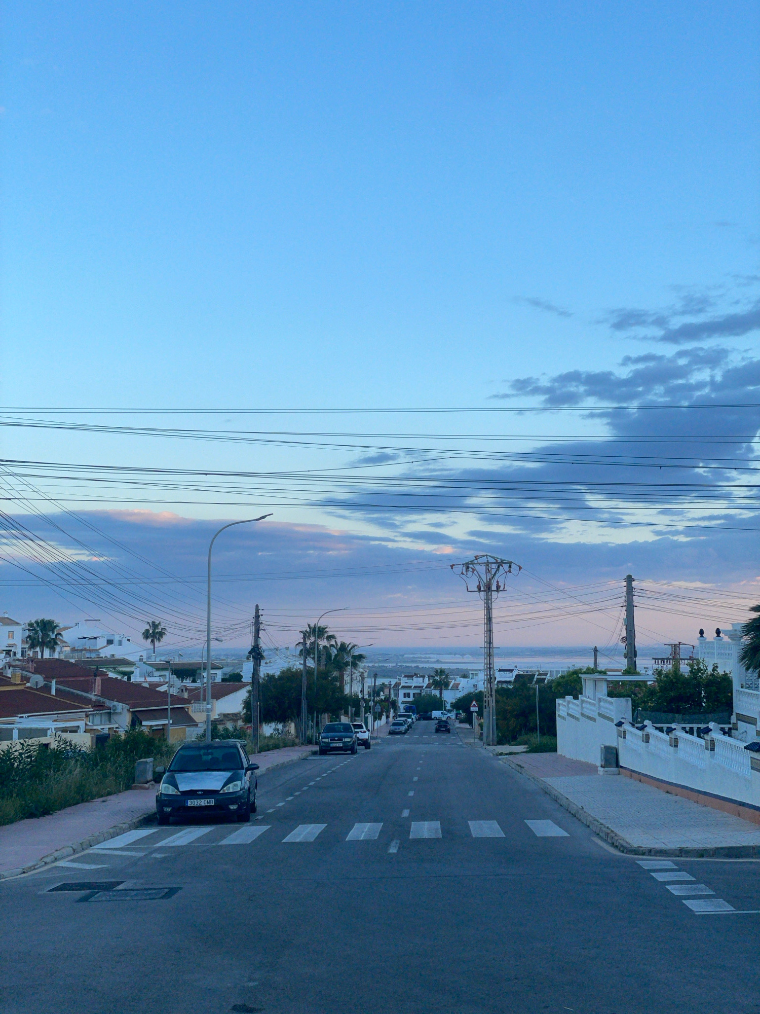 The image depicts a street scene in Rojales, Spain. The street is paved with asphalt and has white lines indicating lanes and pedestrian crossings. A dark-colored car is parked on the side of the road…read more