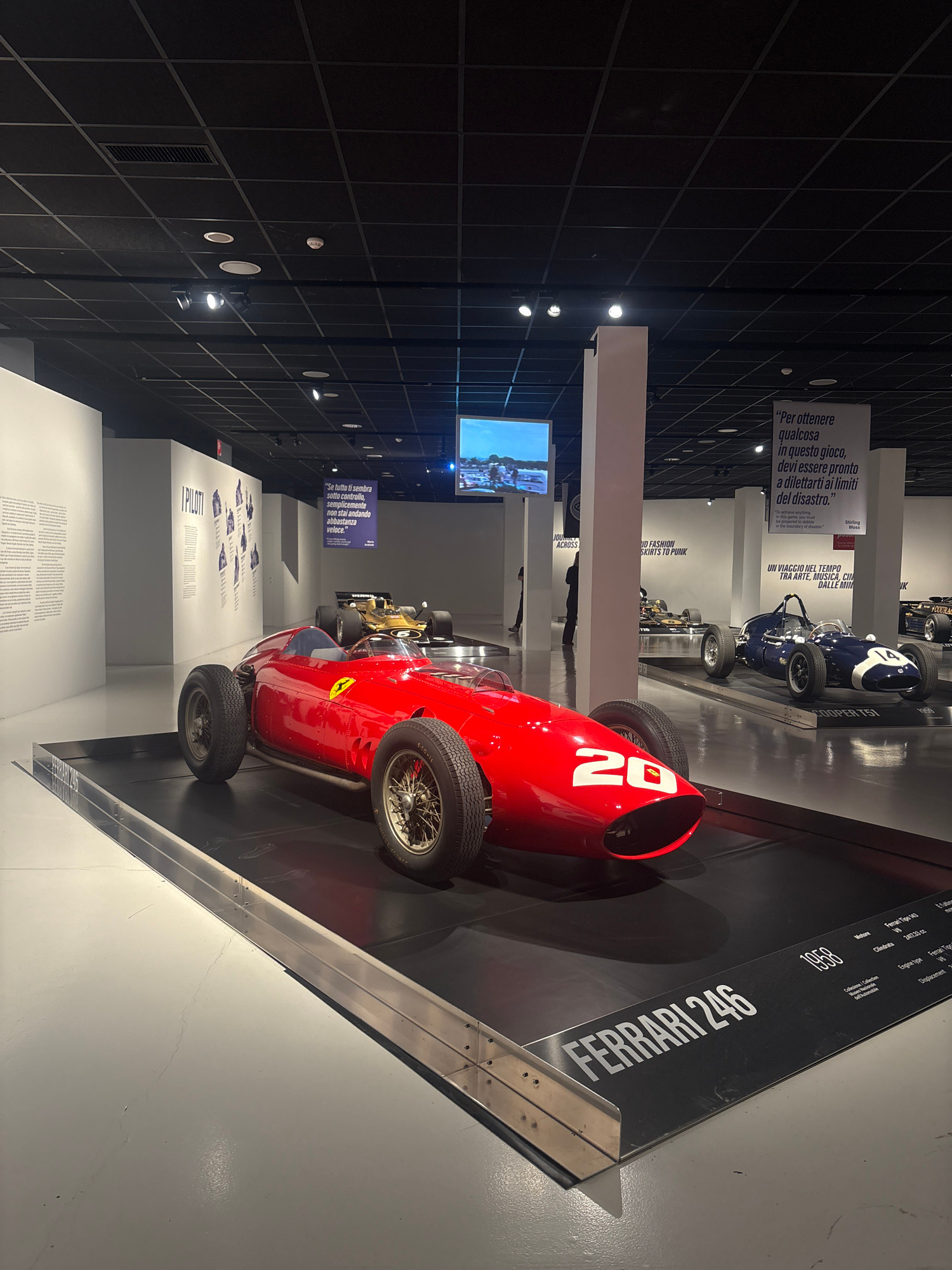 This media file captures an indoor exhibition space, likely a museum in Turin, Italy, showcasing vintage race cars. The image is rotated 90 degrees to the left, showing a red Ferrari 246 race car prom…read more