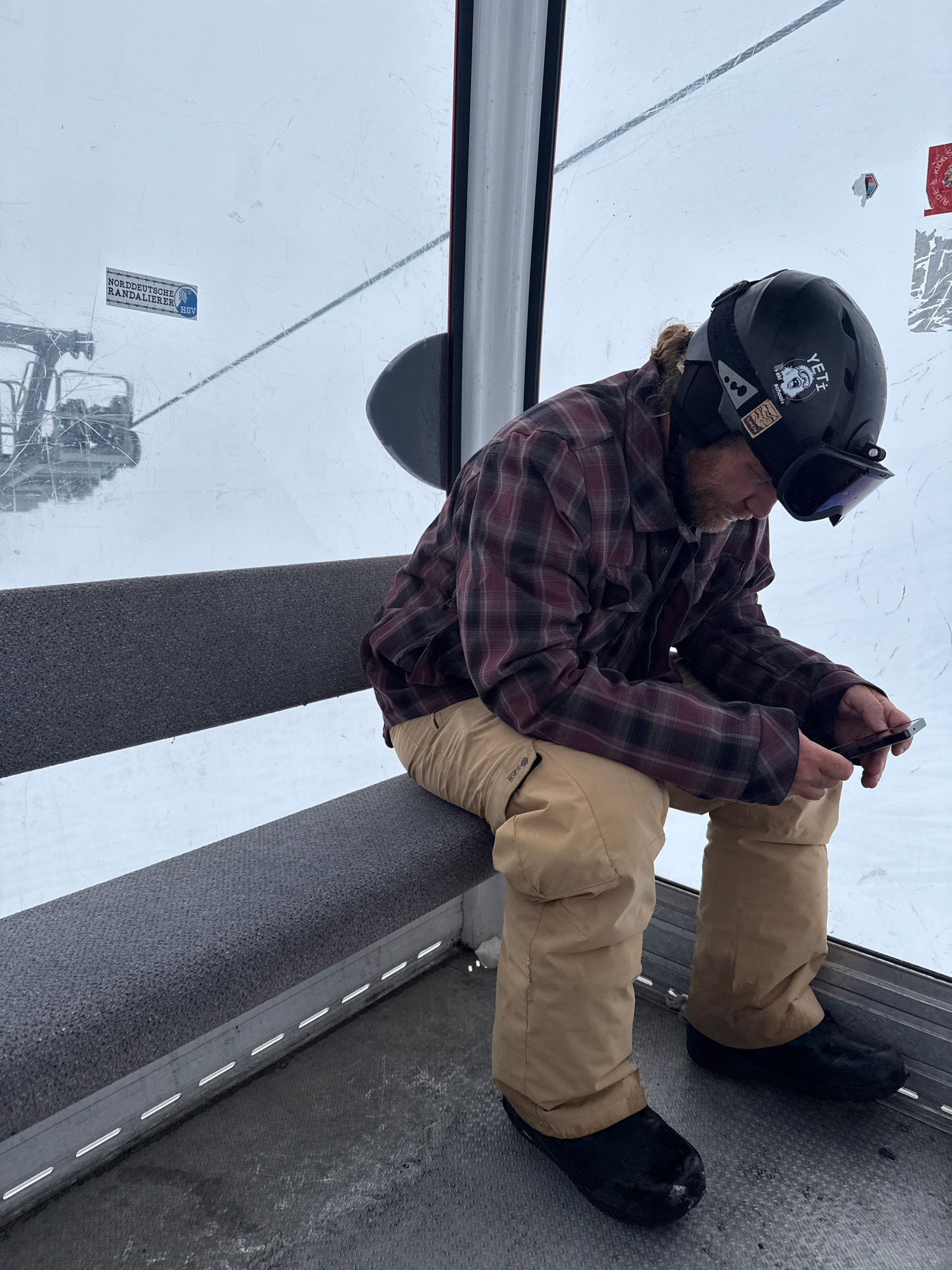A man wearing a helmet and goggles is seated inside a gondola at the Gudauri Ski Resort in Gudauri, Georgia. He's wearing a dark plaid shirt and tan pants. He is holding and looking at a smartphone. T…read more