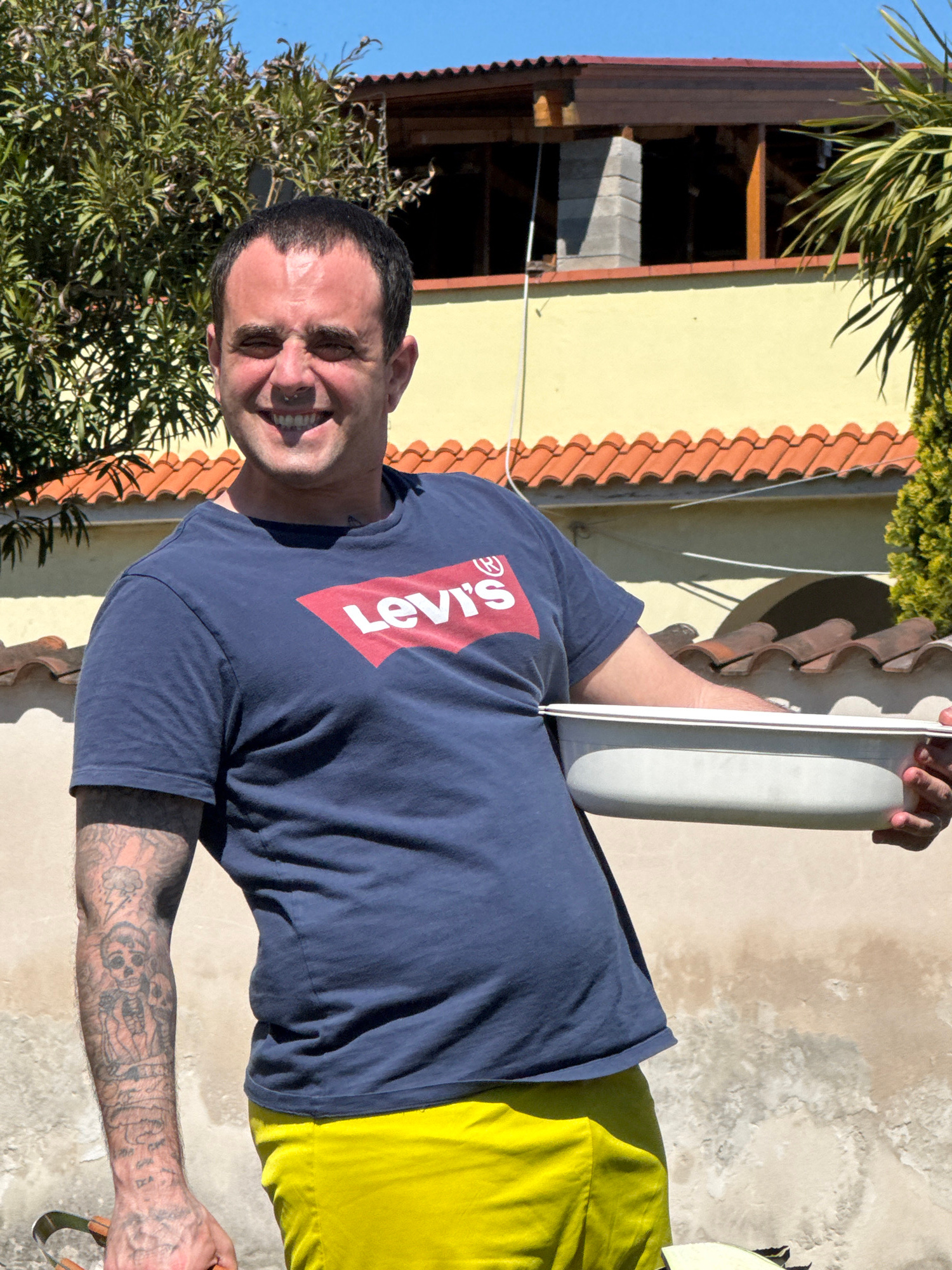 A man is centered in the frame. He has short dark hair and is smiling. He is wearing a navy blue t-shirt with a red Levi's logo and yellow shorts. His right arm has multiple tattoos. He is holding a w…read more