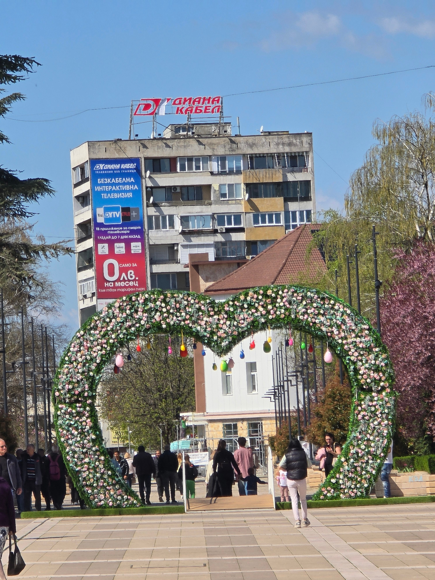 Here is a description of the image: The image shows an outdoor scene in what appears to be an urban setting, possibly a town square. In the foreground, there is a large floral arrangement shaped like…read more