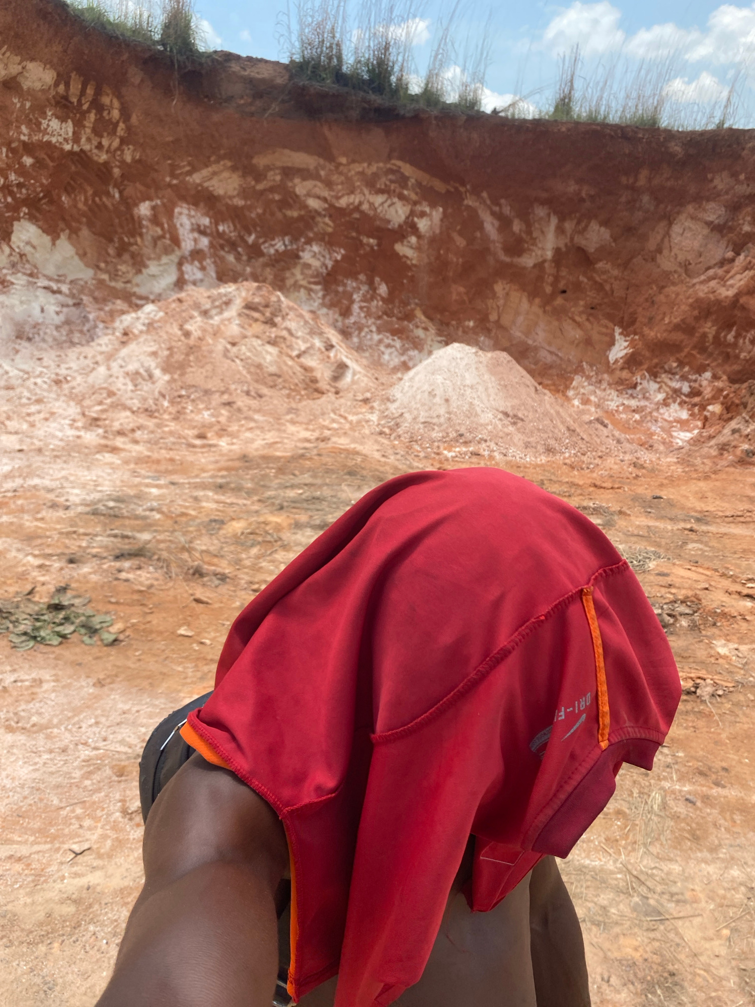 The image shows a person wearing a red Nike Dri-FIT shirt in an outdoor environment near Achara, Nigeria. The location appears to be a quarry or eroded landscape featuring reddish-brown soil and rock…read more