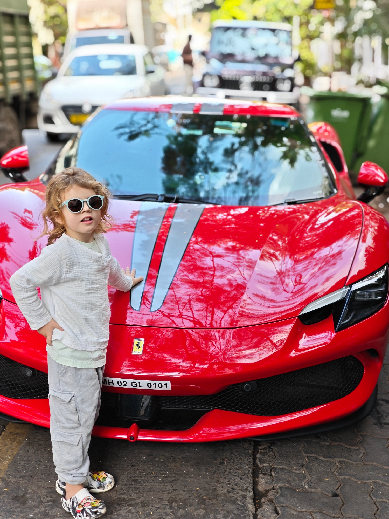 A young child stands next to a red Ferrari sports car in what appears to be a street in Mumbai, India. The child, wearing sunglasses, a white long-sleeved shirt, grey pants, and colorful clogs, is posβ¦read more