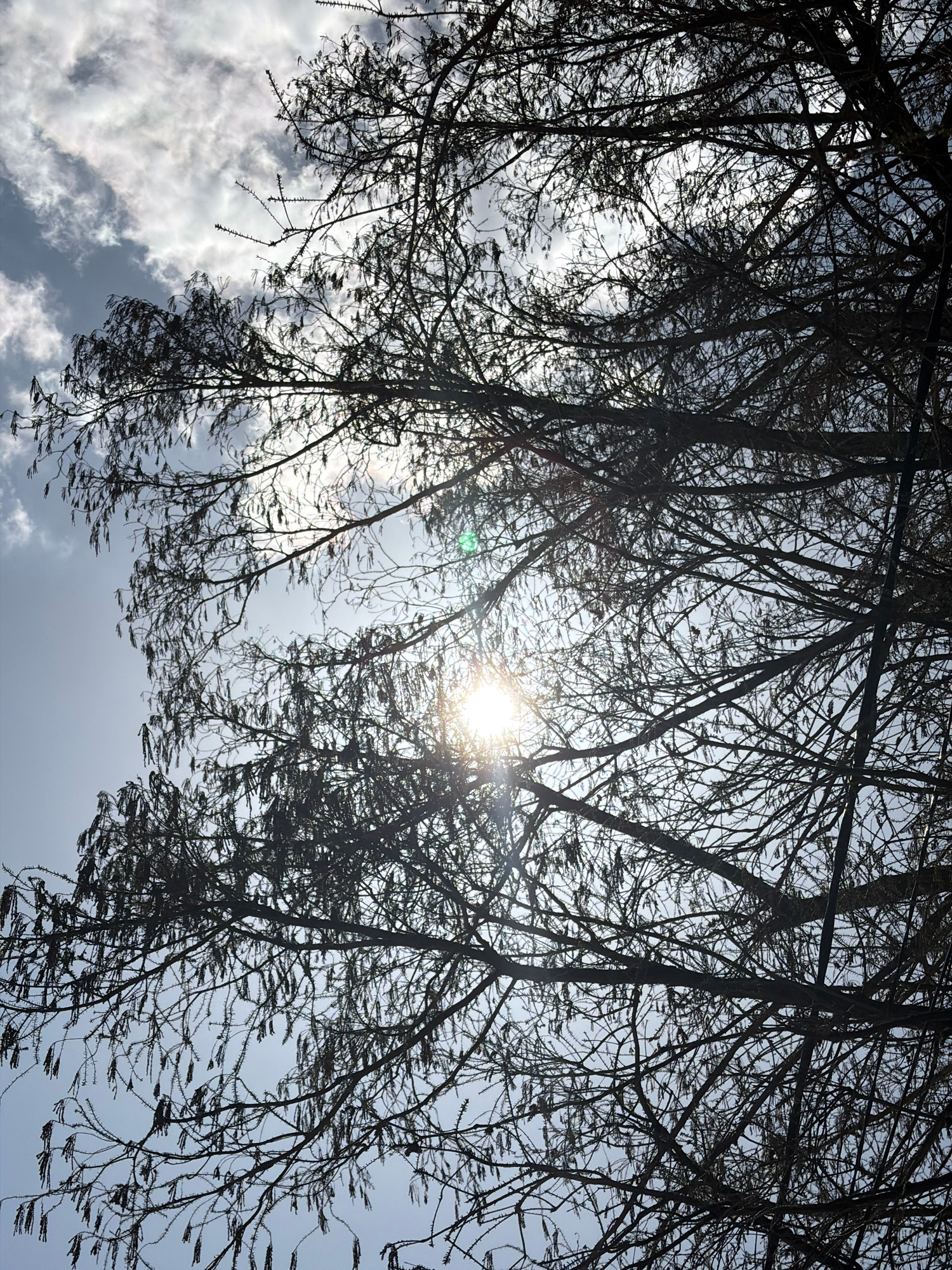 This upward-looking photograph captures the intricate silhouette of tree branches against a bright, partially cloudy sky. The dense, dark network of slender branches and twigs fills most of the frame,…read more