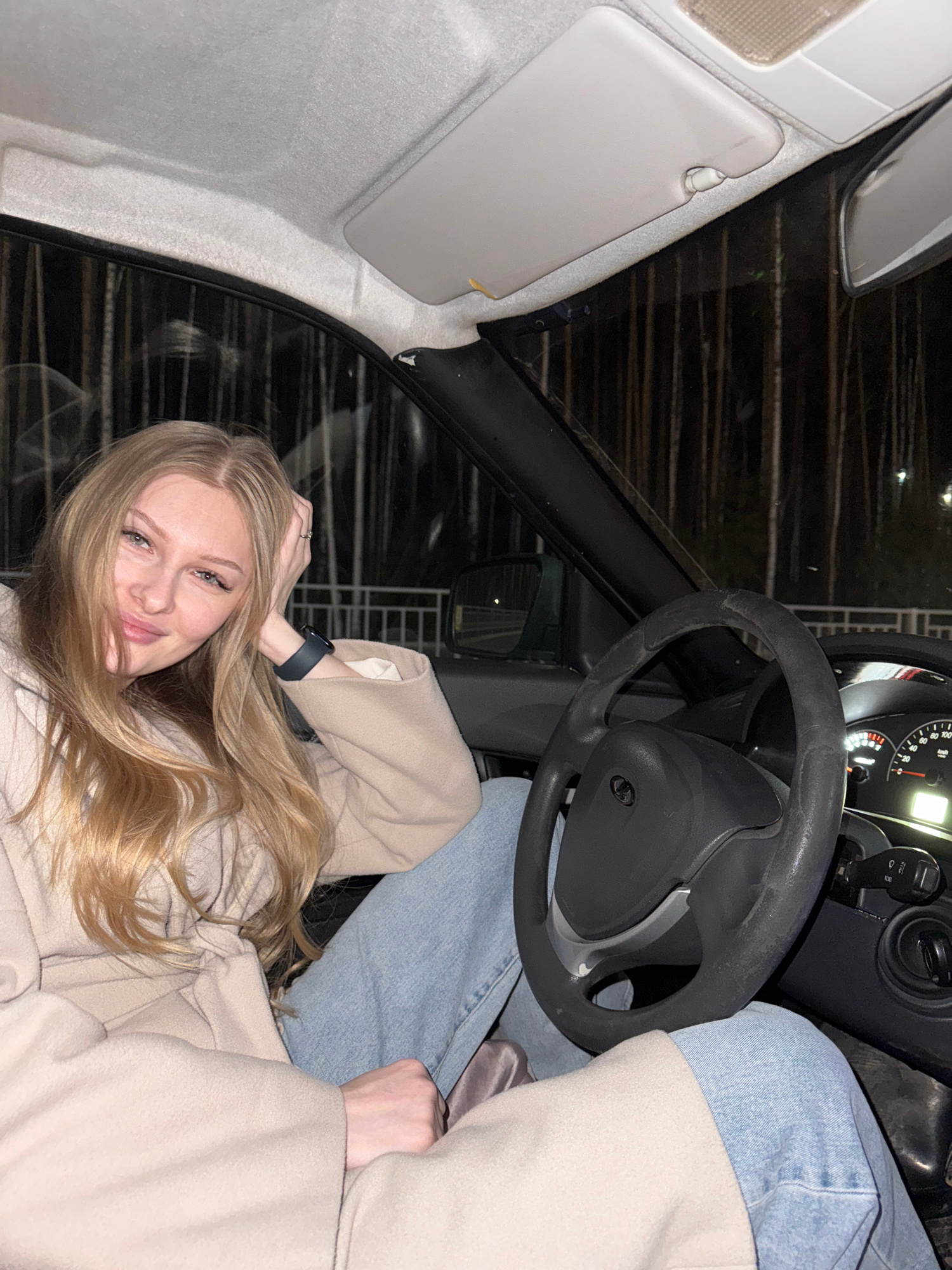 The image captures a young woman seated in a car, smiling and looking towards the camera. The woman has long, straight blonde hair and is wearing a light-colored (beige or tan) coat over light blue je…read more